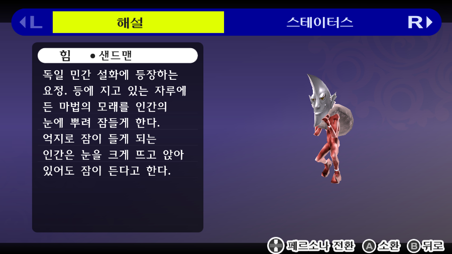 메고 있는 주머니 속에는 마법의 모래가 들어있고, 이것을 인간의 눈에 뿌려 잠재운다.