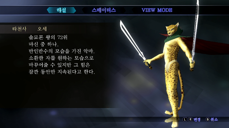 소환하면 표범 머리를 가진 악마 모습으로 나타난다고 한다.