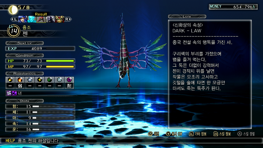 독이 너무나 강력해서 젠이 경작지 위를 닐면 작물은 모조리 고사하고, 깃털을 술에 타면 한 모금만 마셔도 죽는 독주가 된다고 한다.