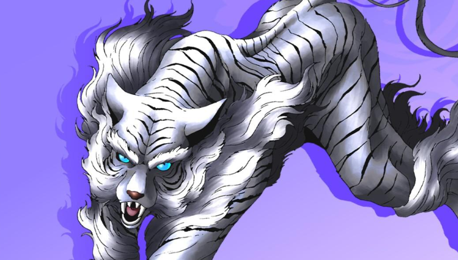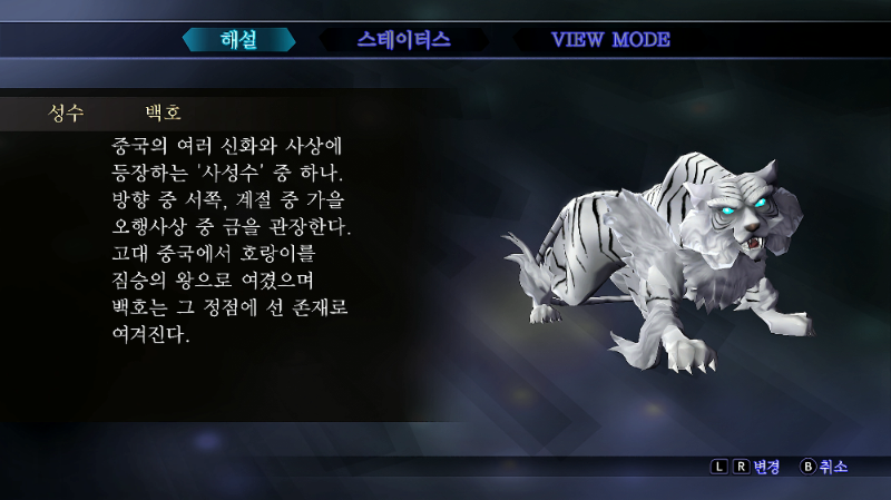 흰 털을 가진 호랑이의 모습이며, 백수의 왕이라 일컬어진다.