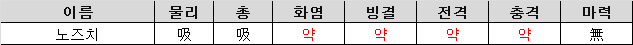 - Aion 오더 대상인 노즈치는 전투에서 아이템 사용이 불가능하고 사이조가 참여하지 않으므로, 준비가 필요하다. 물리와 총이 안 통하지만, 화염 빙결 전격 충격이 모두 약점이니, 스킬을 준비해서 최대한 빨리 쓰러뜨리자. 노즈치 본체는 물리공격과 독이 주 특기이다.