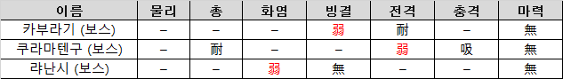- 카부라기는 빙결 약점, 쿠라마텐구는 전격 약점, 랴난시는 화염 약점이다.