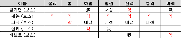 - 철가면은 전격 약점. 제논은 초기 모든 속성이 약점이나 1턴 후 바뀐다.