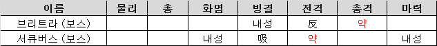 - 보스 - 브리트라. 브리트라는 충격 약점. 서큐버스는 전격 약점이다.