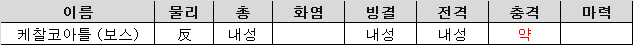 - Aion 오더 - 케찰코아틀은 충격 약점. 그 외는 거의 통하지 않는다. 충격 계열 스킬을 반드시 준비하자. 만능 스킬도 위력이 많이 떨어진다