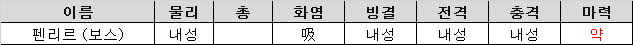 - 펜리르는 마력 약점이며, 총격 외는 모두 내성이 강하다. 화염은 흡수한다.