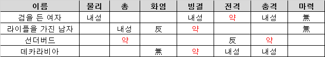 - 여자는 물리, 데카라비아는 마카라칸 테트라칸을 번갈아 사용, 남자는 화염, 선더버드는 전격 스킬을 사용한다
