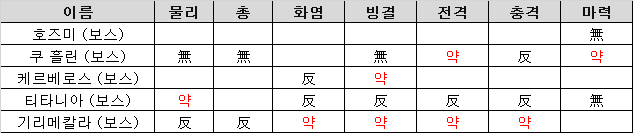 - 쿠 흘린은 전격 마력 약점, 사격으로 공격해온다. 케르베로스는 빙결 약점, 물리와 화염으로 공격해온다