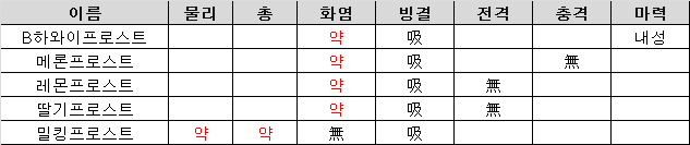 - 밀킹프로스트 외에는 모두 화염 약점. 밀킹프로스트만 물리 총 약점이다