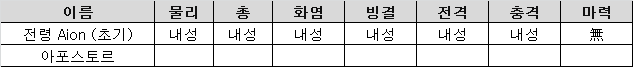 - Aion은 맨 처음은 모든 속성에 내성이 있으나, 일정 턴이 지날 때마다 내성이 변화한다