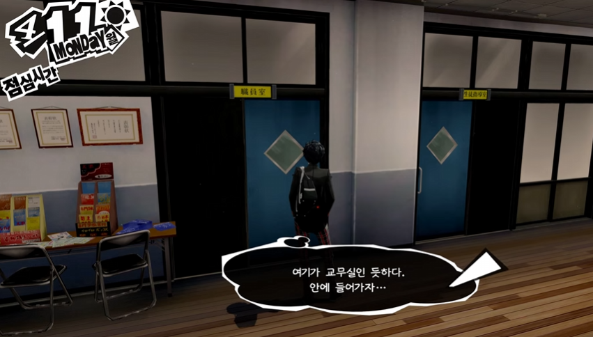 | 4/11(월) | 1) 학교로 이동 2) 카모시다 팰리스 탈출 3) 학교 2층 교무실로 이동 4) 수업 후 학교 옥상으로 이동 |
