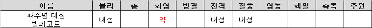 - 보스 - 파수병 대장 (벨페고르) : 화염 약점, 물리 전격 질풍 내성