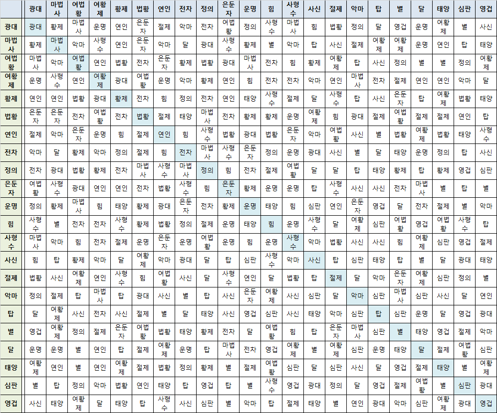 | 전차 | 황제 | 악마 | 마법사 | 악마 | 은둔자 | 정의 | 황제 | 전차 | 마법사 | 절제 | 힘 | 정의 | 운명 | × | 사신 | 사형수 | 달 | × | 운명 | × | × | 사신 | |