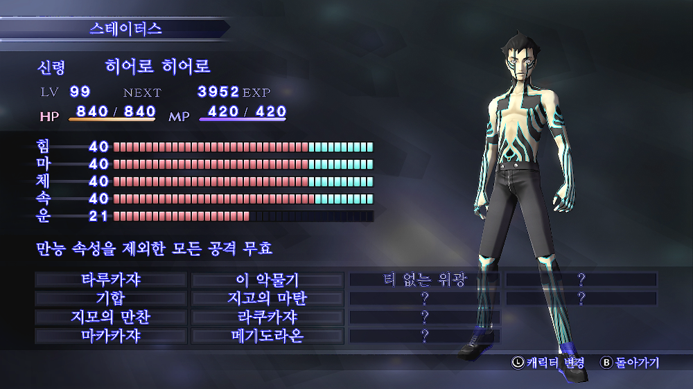 - 최종 마가타마인 마사카두스를 장비하면 운 외의 모든 능력치가 +10이 된다. 그러므로 30까지만 올려두면 힘 마 체 속 4개 능력치를 40 MAX로 만들 수 있다