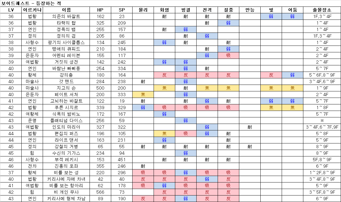 | 이자나미 오오카미 HP : ???? 사용 기술 : 다인계 속성마법, 메기드라온, 컨센트레이트, 차지, 야소가미의 날뜀, 아그네야스트라, 가루가린아이즈, 세계의 종언, 황천으로의 유혹, 흑뢰, 무거운 공기, 악마의 심판, 마하타룬다, 마하라쿤다, 마하스쿤다, 랜더마이저, 데카쟈, 데쿤다 변신 후는 1턴 2회 행동함 |