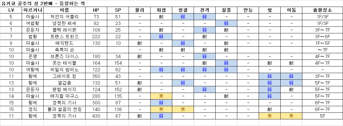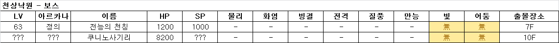 | 아메노사기리 HP : 8500 사용스킬 : 전속성 다인계, 메기도라, 신의 심판, 컨센트레이트, 광대의 속삭임, 혼미의 안개, 네브라오쿠르스, 아그네야스트라, 타루카쟈, 스쿠카쟈, 데카쟈, 데쿤다, 퀘이크 1턴에 2회 행동 |