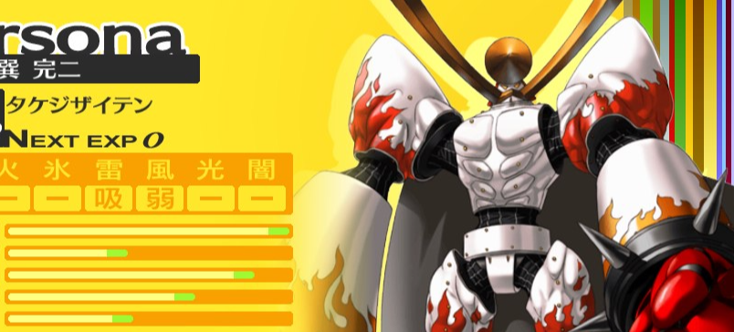 | 페르소나 | 물리 | 화염 | 빙결 | 전격 | 질풍 | 빛 | 어둠 |