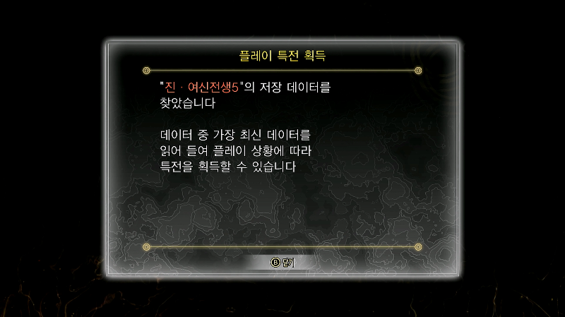 - 같은 닌텐도 계정으로 진여신전생 5 벤전스를 플레이했을 때, 진여신전생5 세이브 데이터를 발견하면 다음과 같은 메시지가 뜨고, 특전을 받을 수 있습니다.