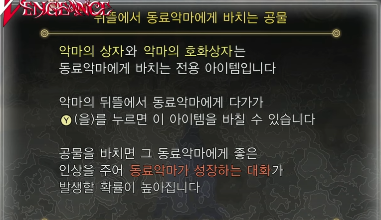 - 악마 앞에서 공물을 전달하여 관계성을 올릴 수도 있음