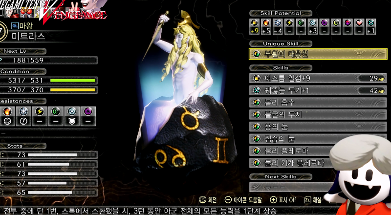 | - 마가츠히 스킬 '마카토키: 만공' 을 사용해 데미지 극대화를 위한 마왕 채용이 필요했음 - 80레벨 초반대 시점에서는 아몬이 구세주. 화염 흡수 때문에라도 채용 - 기본적으로는 마법아이템으로 약점 찔러 턴 벌기, 여차하면 적 전원을 날려보내기 위해 '메기도 플레임' 사용 - 아군 버프를 위한 '라스타캔디' 채용, 타오가 있어 사용 빈도가 적지만, 필요 시기에는 꼭 써야 함 - 레벨 문제로 랜더마이저를 못 배웠음... 허물을 사용할 수도 있었지만... 참았음 - 벤전스에서는 레벨 87로 변경되었음. 그러므로 레벨 82로 변경된 미트라스가 화염 흡수로 같은 역할을 해 줄 수 있음 ![]() |