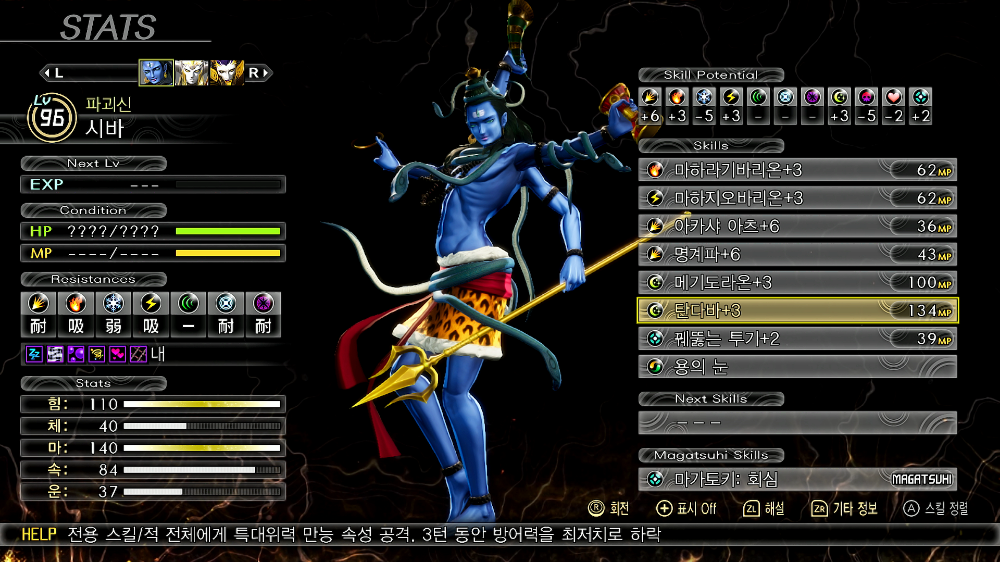 | 시바 | 탄다바+3 (만능 전체) 메기드라온+3 (만능 전체) 마하라기바리온+3 (화염 전체) 마하지오바리온+3 (전격 전체) 명계파+6 (물리 전체) 아카샤아츠+6 (물리 1인) 꿰뚫는투기 용의눈 |