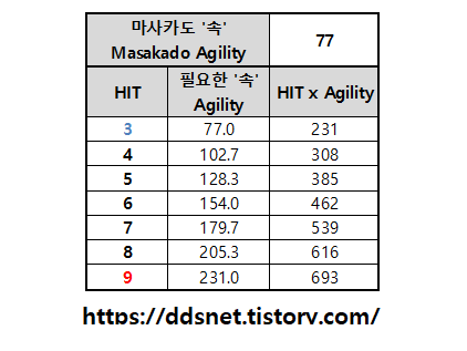 - 예를 들어 마사카도는 창생 난이도에서 기본 형태 속도가 343이라, 최대 히트수 9타를 맞추려면 1029 이상이 필요하게 되어 버림