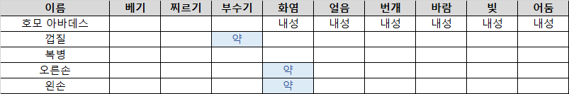 - 껍질은 부수기 약점, 손은 불꽃 약점, 심장은 마법 내성