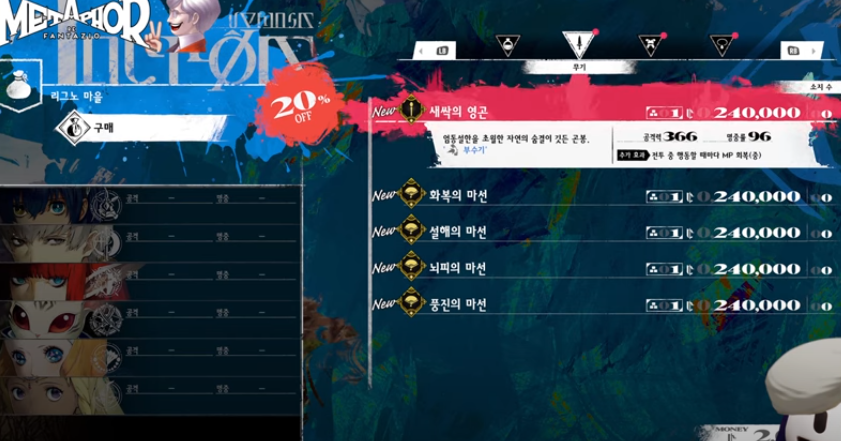 - 기본가 300,000, 휴식일 할인가 240,000의 비싼 무기와 방어구를 판매