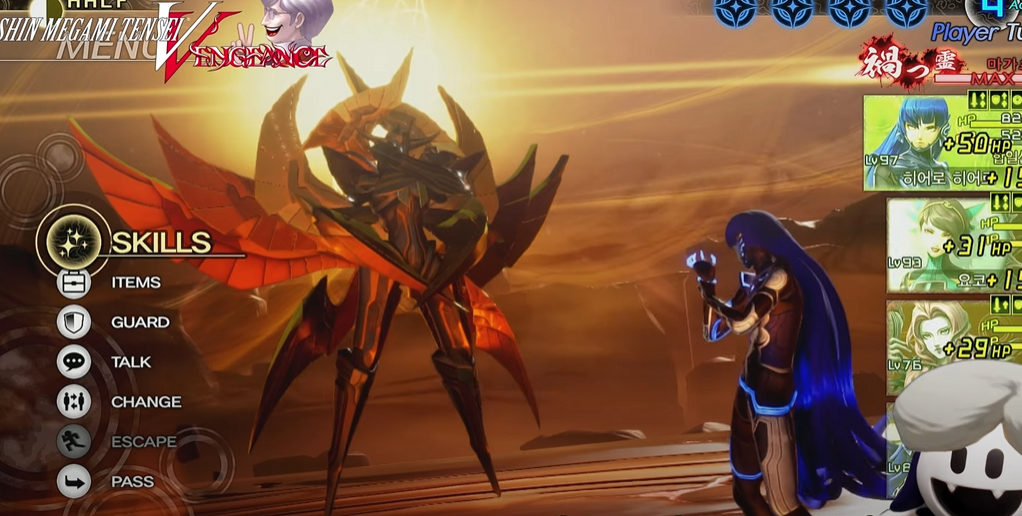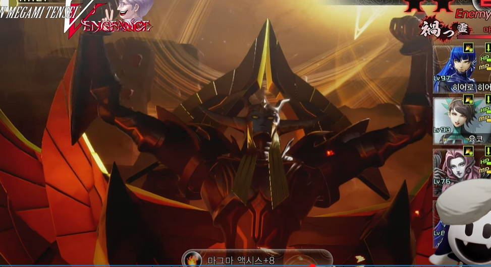 - 6속성 모두 흡수가 되거나, 마가츠히를 모은 후에는 만능 전체 스킬을 사용하는데, 위력이 높으므로 방어를 하거나 미리 대비해 두는 것을 권장