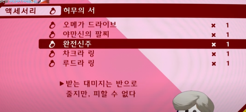 - 완전신주 (여황제 알릴라트 수태 아이템, 데미지가 절반이 되나 회피 불가능)
