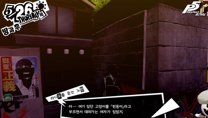 | 26 | 목 | 1] 수업 : 코난 도일 (지식+) | 1] 도서관 책 대여 : "전승의 의적" 대여 2] SNS : 미션 "마을에서 고양이가 사라진다면" 발생 3] 욘겐자야 : 탐문하여 미션 대상자 특정 4] 전차(류지) 코옵 4→5 선택 1>프로테인~ 2>복잡하겠네~ 3>싫은~ 전화>1 |
