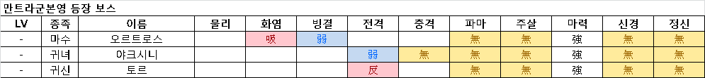 - 오르트로스와 야크시니는 각각의 약점을 공격하고, 토르는 약점이 없으므로 가지고 있는 가장 강력한 스킬에 카쟈계 버프를 걸고 공격할 필요가 있다. 이전 보스들에 비해 난이도가 높으므로 주의.