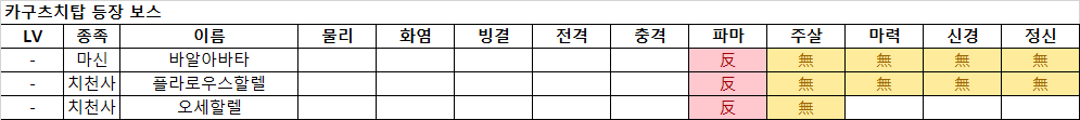 - 바알 아바타가 사용하는 '바엘의 저주' 는 아군 1체를 파리로 만든다. 파리가 되면 능력치가 극도로 떨어지므로 교체해 주자. 마카라칸 또는 마력 속성이므로 마력 무효로 막을 수 있다.