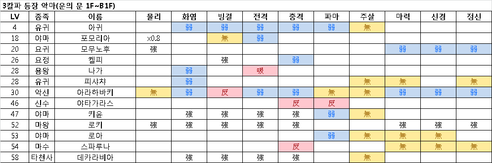 | 서쪽(힘 25이상) | DARK | 마도, 마투사, 마군장, 마제 | 150,000 마카 LV 4 유귀 아귀 (幽鬼 ガキ) 스킬 : 메기도, 메기도라, 메기도라온, 메디아라한, 사마리컴, 테트라칸, 마카라칸, 리컴도라 |