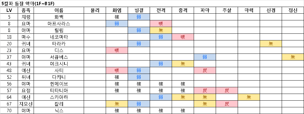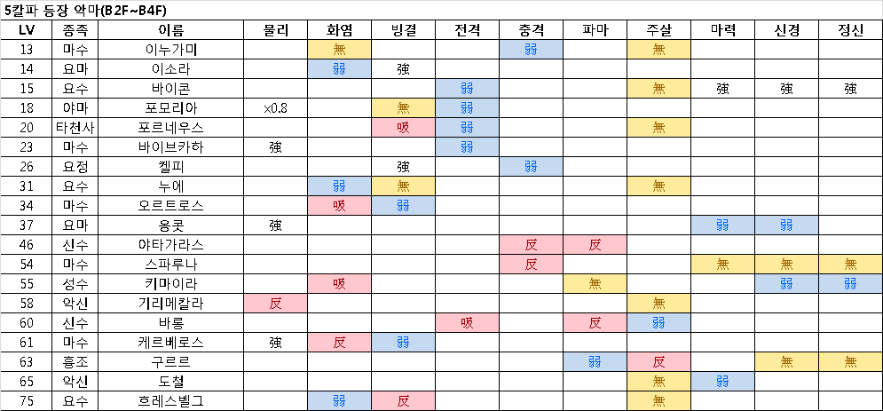 | 혼돈 (B4F 남서쪽) | 벨제부브 파리 형태 (체력 25 또는 속도 20 체크하는 문 중 하나를 통과해야 한다) |
