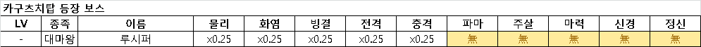 | ▷BOSS 대마왕 루시퍼(大魔王 ルシファ-) LV ?? HP ????? MP ????? 사용기술 : 왕 중의 왕, 태초에 어둠이 있나니, 사악한 빛, 메기드라, 메기드라온, 프로미넌스, 절대영도, 마하라기다인, 마하부후다인, 디아라마, 데카쟈, 데쿤다 |