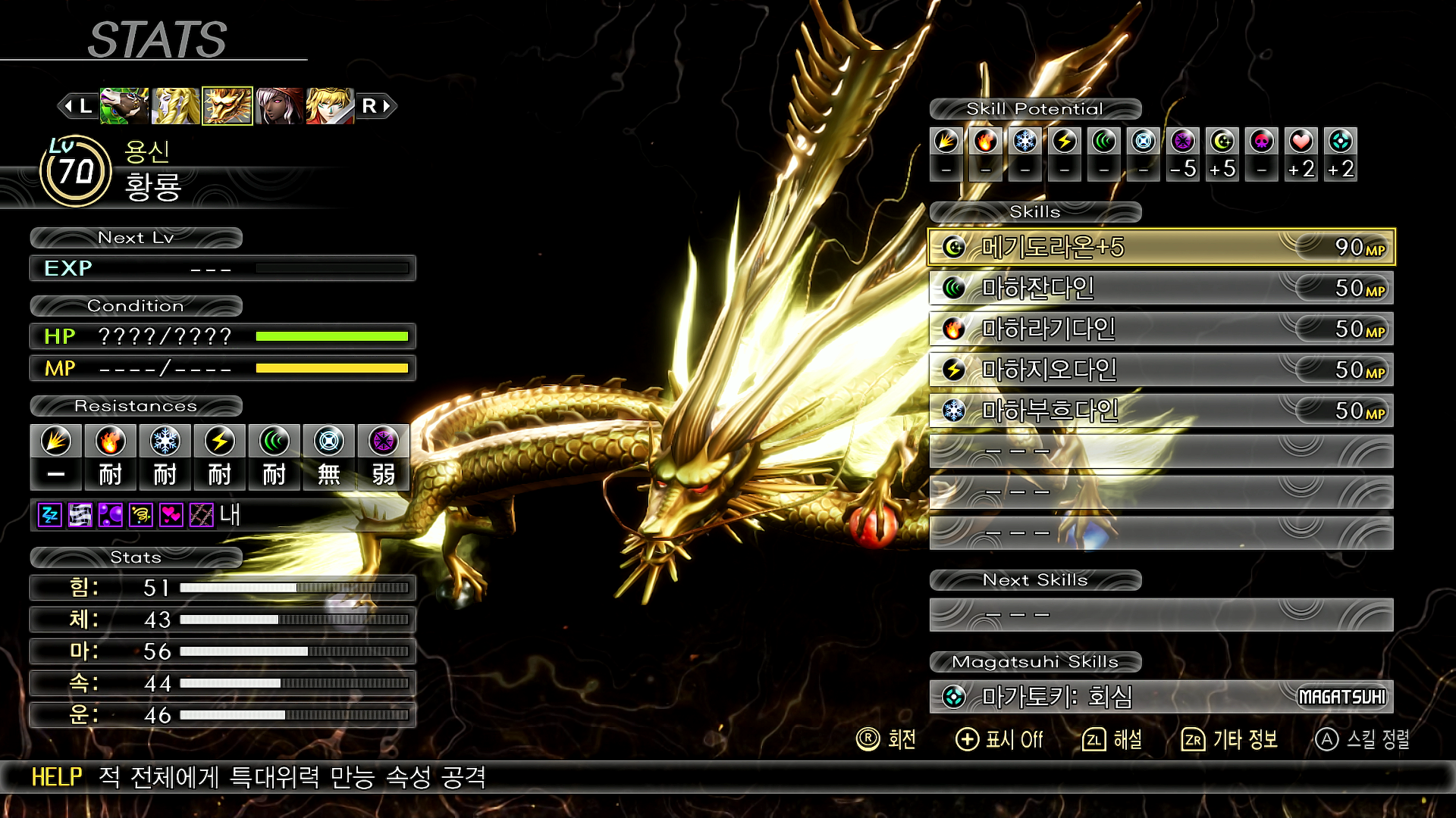 - 황룡은 4속성 전체마법을 사용하지만, 만능 속성 메기드라온 사용 비중이 높다. 만능 속성은 내성으로 막을 수 없으므로 보조마법을 준비하도록 하자.