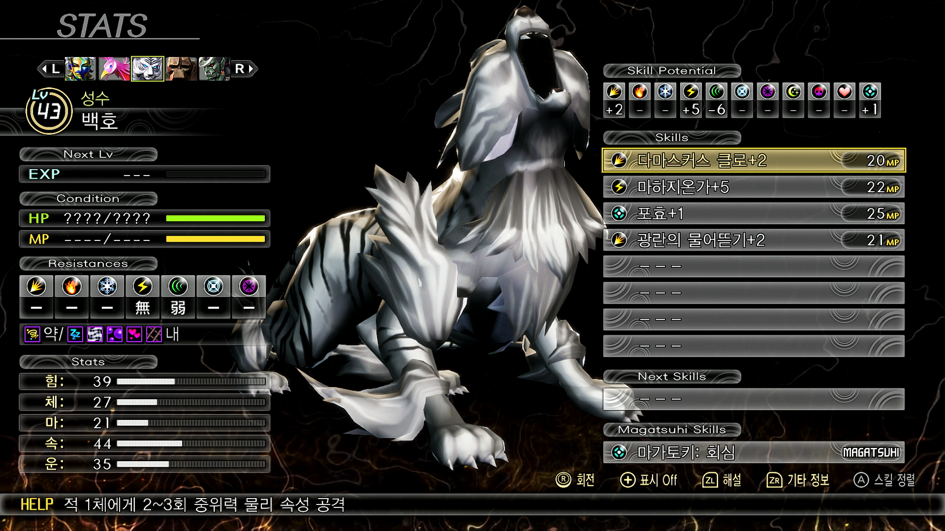- 백호는 물리 공격을 주로 사용하며, 마가츠히가 모이면 전격 스킬을 사용한다. 충격이 약점이다.