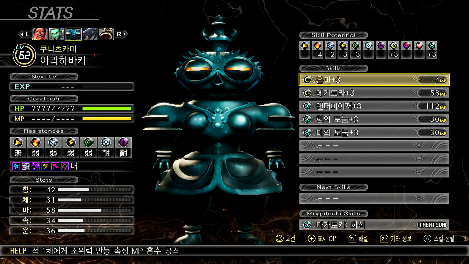 - 아라하바키는 물리 무효이나, 화염 빙결 전격 충격 4가지를 약점으로 가지고 있으니 약점 준비가 편하다. 특이하게 만능 스킬로 공격해오며, 마가츠히를 모으면 흡마를 사용하므로 무시하거나 방어하자.