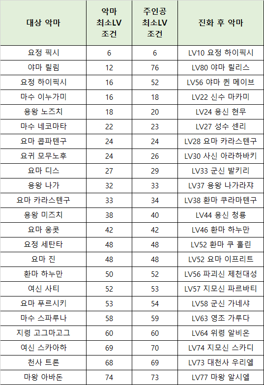 | 대상 악마 | 악마 최소 LV 조건 | 주인공 최소 LV 조건 | 진화 후 악마 |