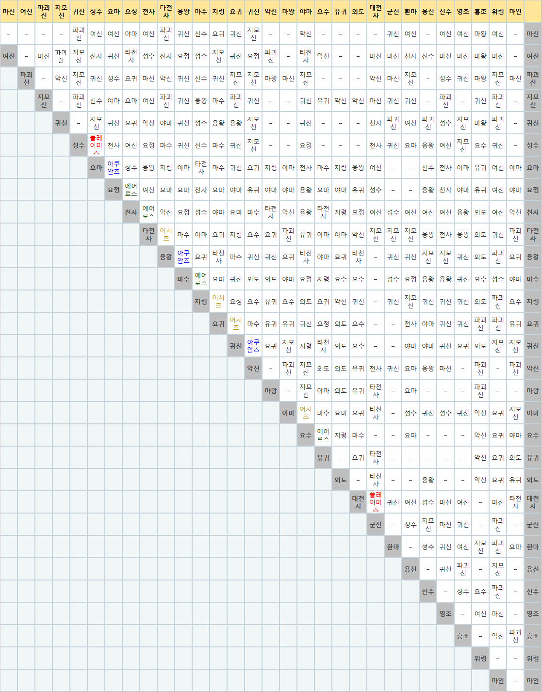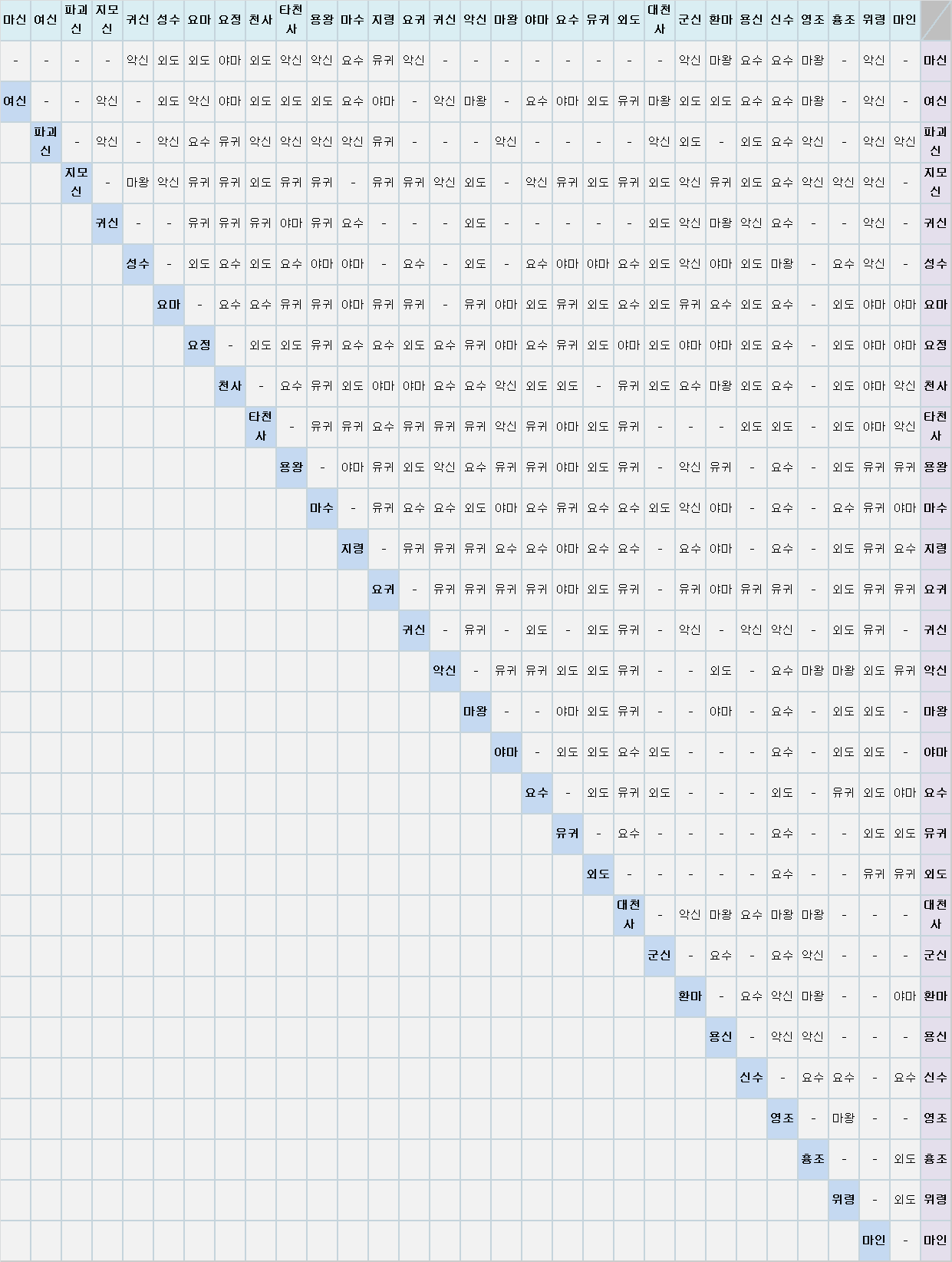 | - | - | 악신 | - | 외도 | 악신 | 야마 | 외도 | 외도 | 외도 | 요수 | 야마 | - | 악신 | 마왕 | - | 요수 | 야마 | 외도 | 유귀 | 마왕 | 외도 | 외도 | 요수 | 요수 | 마왕 | - | 악신 | - | 여신 | ||