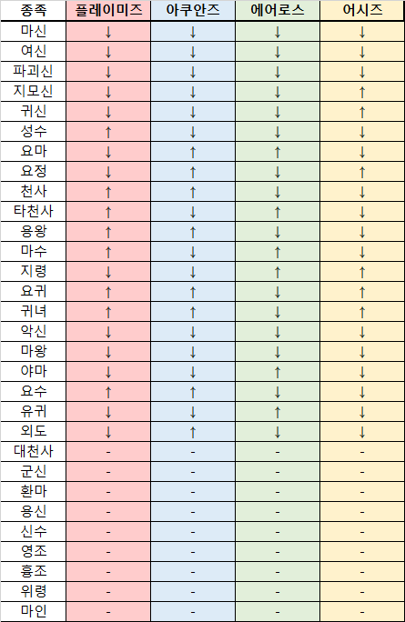 | 어시즈 | 마수 | 요마 | 요귀 | 타천사 | – | 성수 | 귀녀 | 성수 | 귀녀 | 악신 | 요귀 | 지모신 | 야마 | ||||||||||||||||||