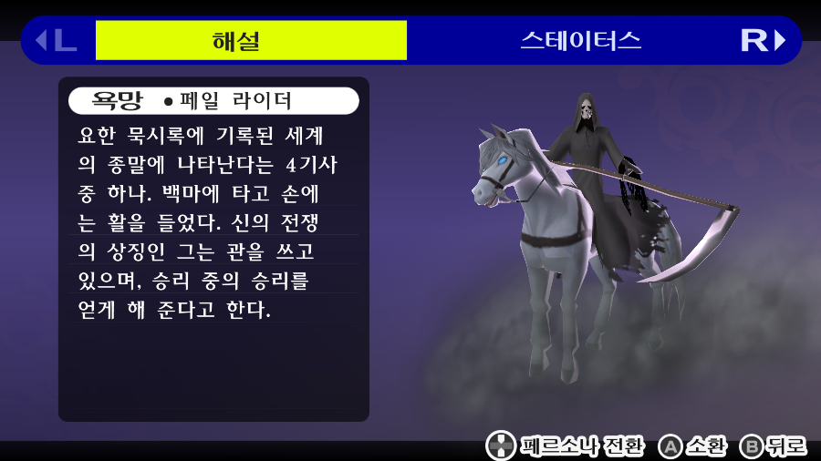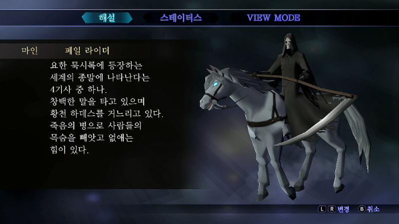 푸르스름한 말을 탄 사신의 모습으로 황천의 주인을 거느린다.