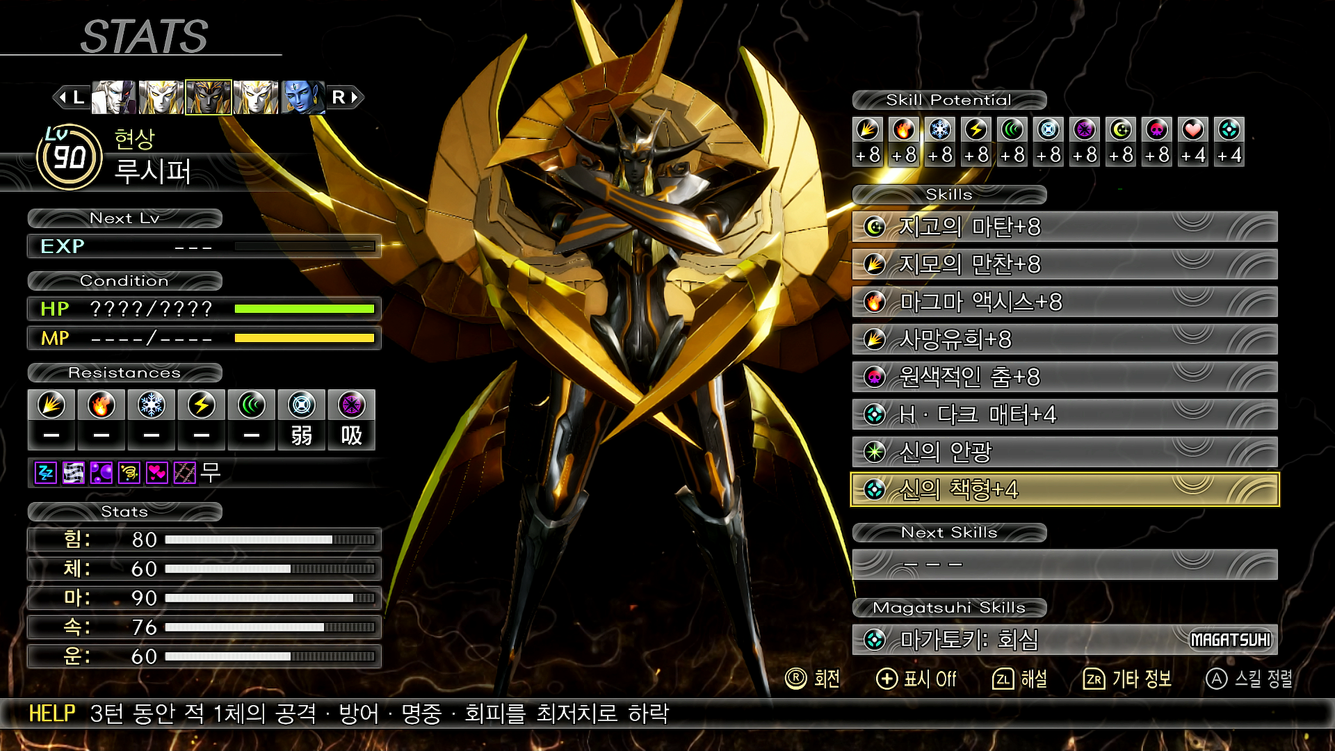 - 루시퍼 1번째 페이즈에서는 물리에 내성이 있고 주살과 만능 외의 모든 공격을 흡수 또는 무효화한다. 가능하면 만능 또는 관통이 부여된 스킬을 사용하는 것을 추천한다.