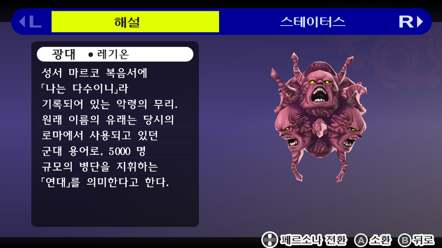 성서「마르코 복음서」제5장에 기록되어 있는 악령으로, 증오와 질투에 불타는 악질적인 사령이다.