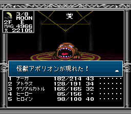 사이버네틱 암을 장착했으니 다시 그 악마의 입으로 돌아가자. 악마의 입이 다시 닫히지만, 사이버네틱 암은 끄덕도 하지 않는다. 이제 물의 필라를 손에 넣었으니, 이케부쿠로 1층 북동쪽의 계단을 통해 2층으로 가자. 거기엔 히로코를 잡고 있는 괴수 아폴리온이 기다리고 있었다. 아폴리온은 히어로들을 기다리고 있었다며 공격을 개시해 온다.