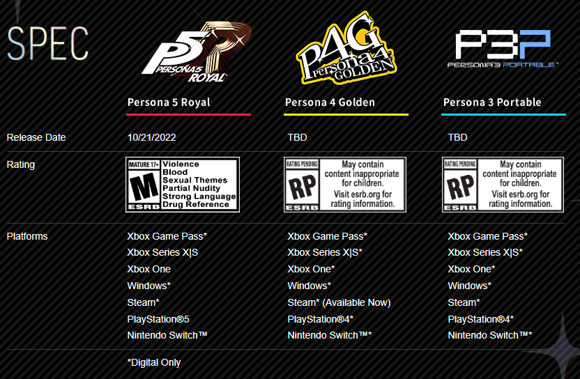 페르소나3와 페르소나4는 모든 기종 다운로드 전용 소프트웨어로 발표되었습니다.