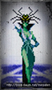 머리에 검은 거미를 얹은 여성 또는 검은색의 거미로 그려진다.