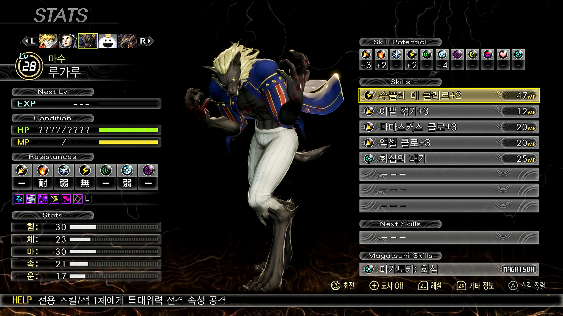 - 보스 루가루는 물리 공격이 주특기이다. 물리내성이 있는 동료에게 도발을 써서 탱커 역할을 하는 것이 유효하다. 회심의 패기를 쓰면 크리티컬이 나오므로 방어를 해 준다. 마가츠히를 모은 다음 턴엔 강력한 전격 기술을 사용하니 방어하거나 뇌장부를 사용해 막는 것을 권장한다. 공격은 약점인 빙결과 파마 계열을 준비하자.
