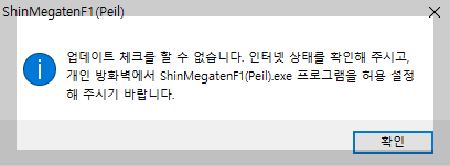 개인 방화벽에서 ShinMegatenF1(Peil).exe 또는 ShinMegaten2K(Peil).exe 프로그램을 허용 설정해 주시기 바랍니다.